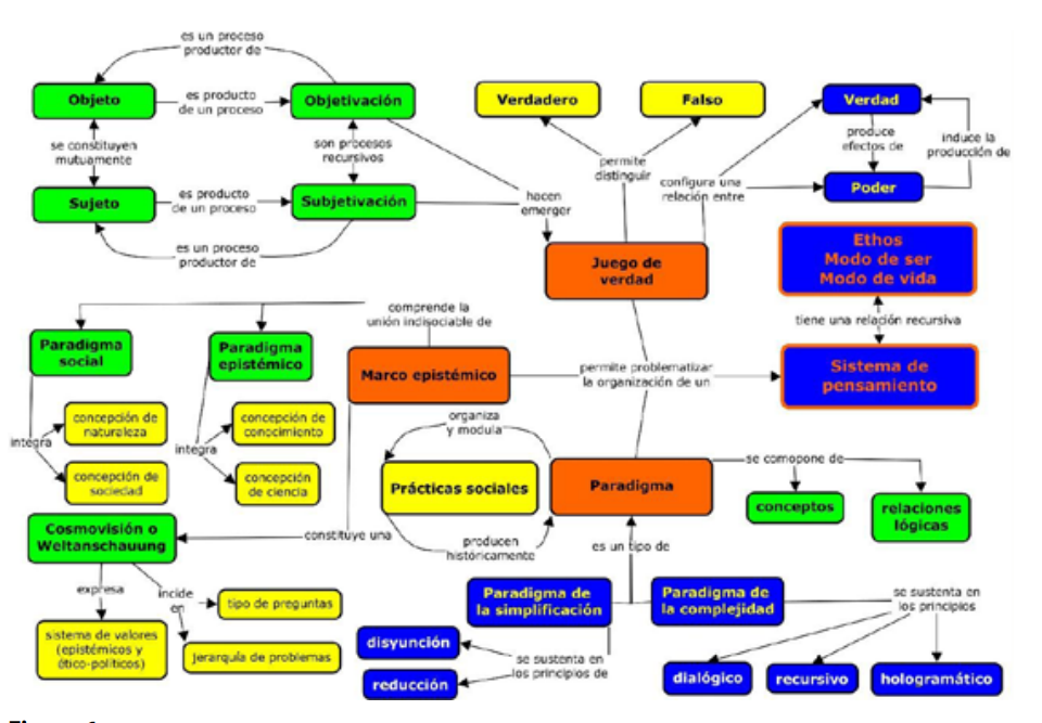 En el mapa conceptual de la Figura 1 proponemos un meta-modelo epistemológico para pensar la ciencia y la construcción de conocimiento científico a partir de la integración de los conceptos examinados en las secciones precedentes. Si bien no ha habido un diálogo sistemático y explícito entre la obra y el pensamiento de M. Foucault, J. Piaget y E. Morin, es pertinente señalar algunos aspectos epistemológicos comunes. La convergencia principal destaca que los conceptos de juego de verdad, marco epistémico y paradigma constituyen vías complementarias para problematizar la organización de un sistema de pensamiento. La obra de los tres autores permite destacar también la relación mutuamente constitutiva entre el pensamiento y la subjetividad humana, esto es, entre nuestro estilo de razonar —nuestra práctica del pensar— y nuestro estilo de vida —nuestro modo de ser sujeto—. El concepto de ethos permite captar la relación recursiva que existe entre un sistema de pensamiento y un modo de ser o de vivir. De aquí se sigue que un cambio epistemológico profundo en la organización de un sistema de pensamiento implica, correlativamente, transformaciones profundas en la vida y la subjetividad humana.